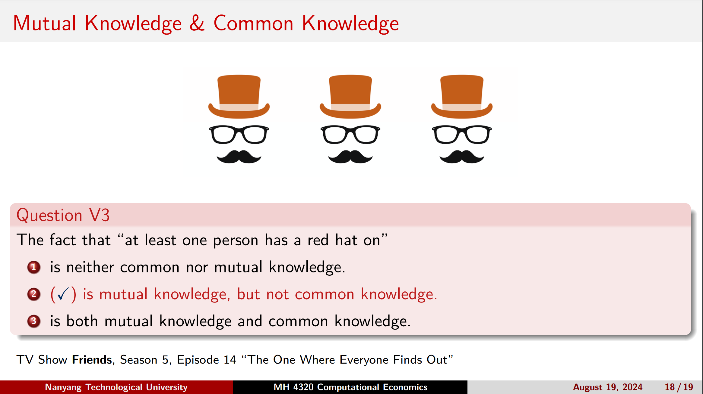 Common Knowledge: 如果任意一个 player 序列 \(i_1, i_2, \cdots, i_k\),我们有 \(i_1\) 知道 \(i_2\) 知道 \(\cdots\) 知道 \(i_k\) 知道某个 knowledge,那么我们说这个 knowledge 是 common knowledge。