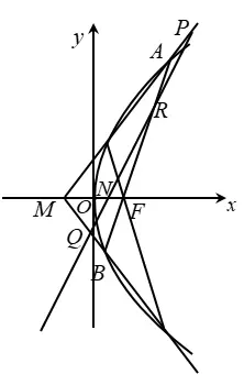 (2)设过点 F 的直线交抛物线与 A、B 两点,斜率为 2 的直线 l 与直线 MA,MB,AB,x 轴依次交于点 P,Q,R,N,且 ∣RN∣2=∣PN∣⋅∣QN∣,求直线 l 在 x 轴上截距的范围。